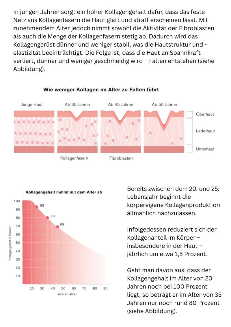 Es ist ein essenzieller Baustoff für Haut, Knochen, Muskeln, Sehnen, Bänder und Bindegewebe. Es wirkt wie ein biologisches Stützsystem, das alles zusammenhält und für Spannkraft, Stabilität und Jugendlichkeit sorgt. Mit zunehmendem Alter nimm die körpereigene Kollagenproduktion ab - bereits zwischen dem 20. und 25. Lebensjahr kann sie bis zu 1% pro Jahr sinken. Die Folge: Hauterschlaffung, Faltenbildung, schwächeres Bindegewebe und Gelenkbeschwerden.