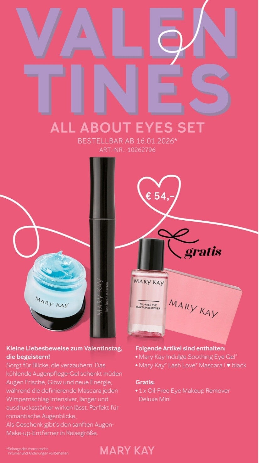 Sorgt für Blicke, die verzaubern. Das kühlende Augenpflege-Gel schenkt müden Augen eine sofortige Frische, Glow und neue Energie. Während die definierende Mascara jeden Wimpernschlag noch intensiver, länger und ausdrucksstärker erscheinen lässt. Perfekt für romantische Augenblicke.